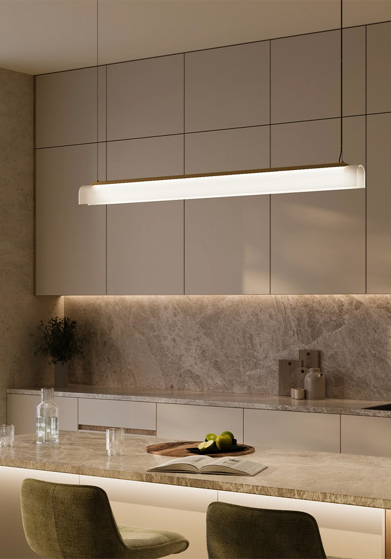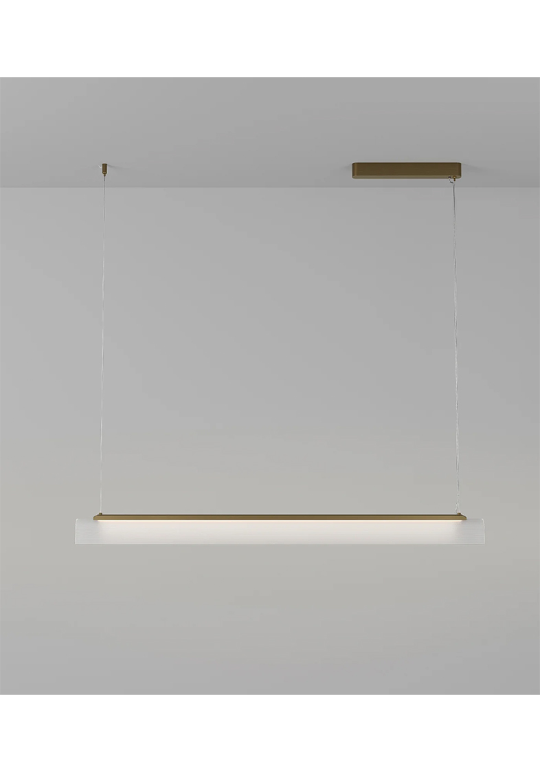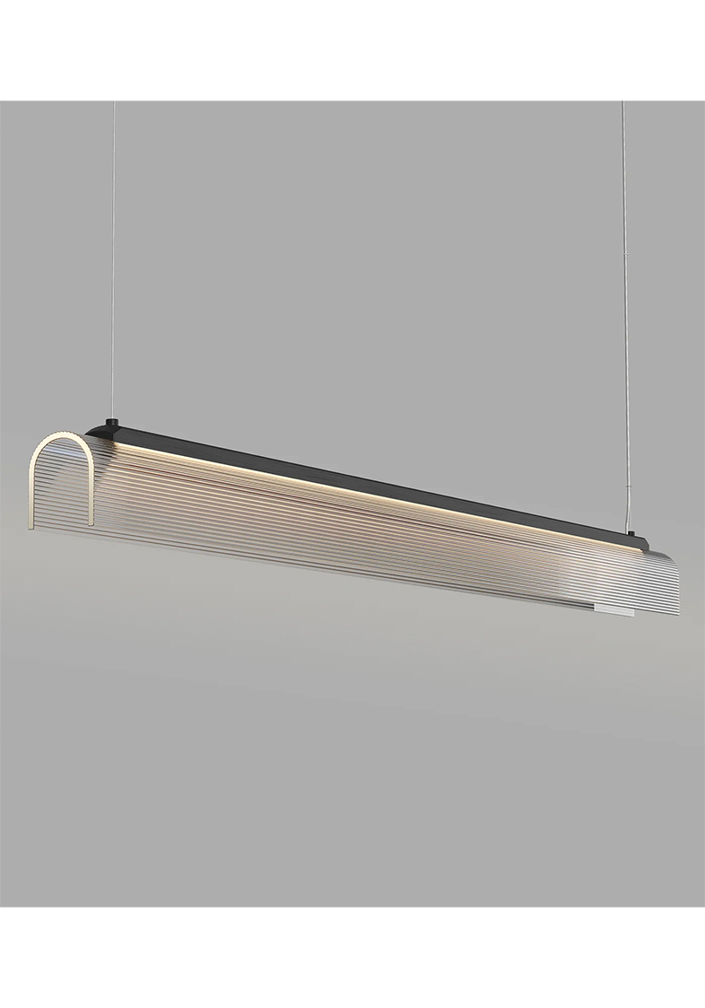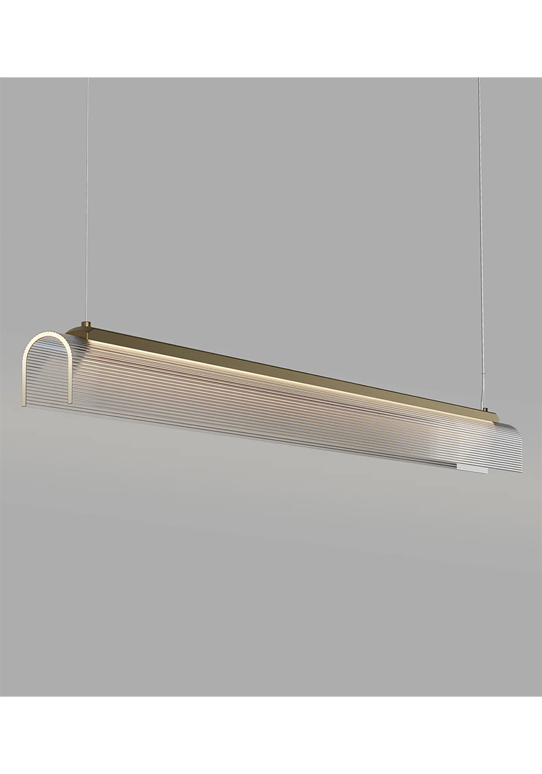 Edge Linear Pendant Light by offers a bold, architectural take on modern lighting. Defined by its clean lines and sharp form, paired with a delicate fluted glass shade slumped by hand, this designer pendant light combines a structured silhouette with refined material contrasts. Available in Old Brass or Iron finish, with a ribbed borosilicate glass shade in clear or frosted options.