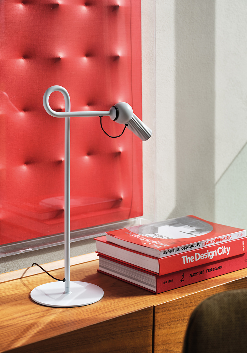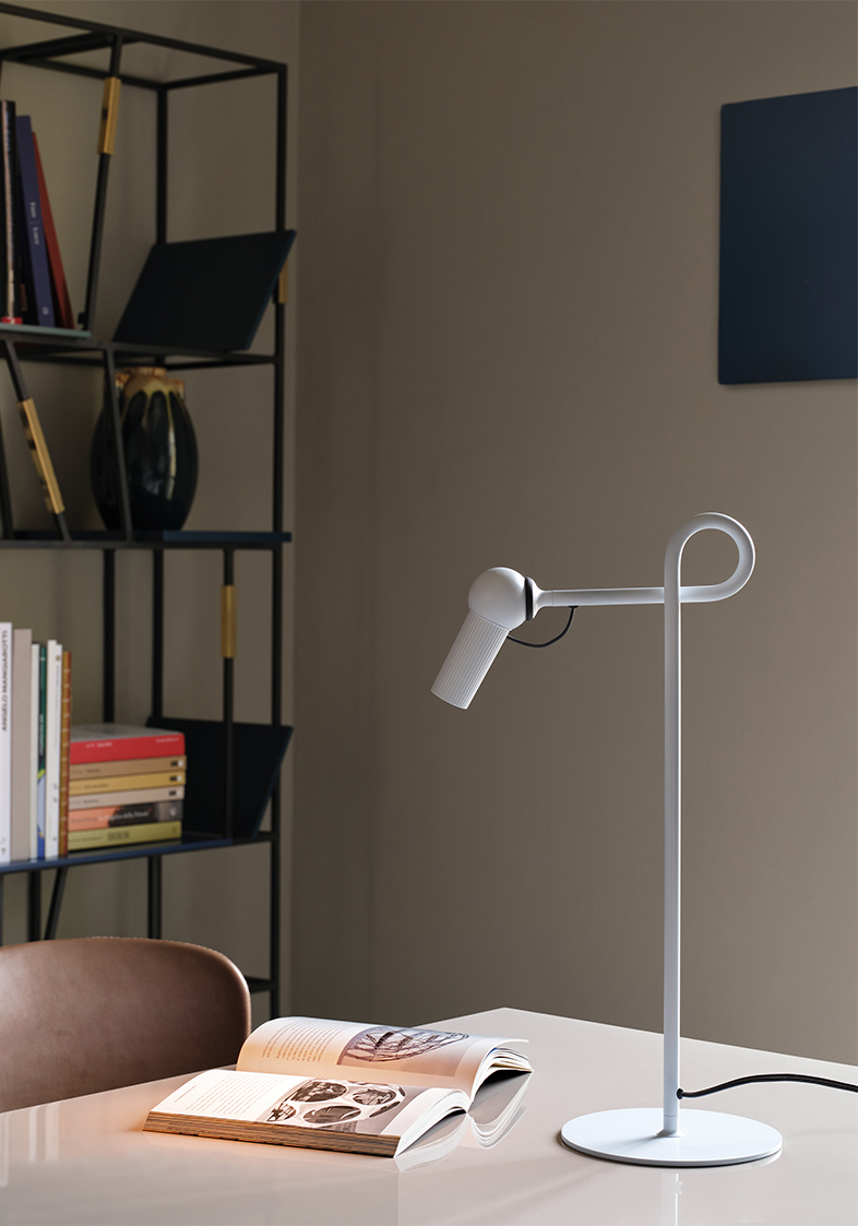 The perfect balance between shape and function. With its simple but distinctive design, this table lamp features a diffuser with a magnet fastening, allowing it to be moved with precision, thus ensuring the right lighting wherever needed. The brightness of the light can be adjusted by the dimmer switch.