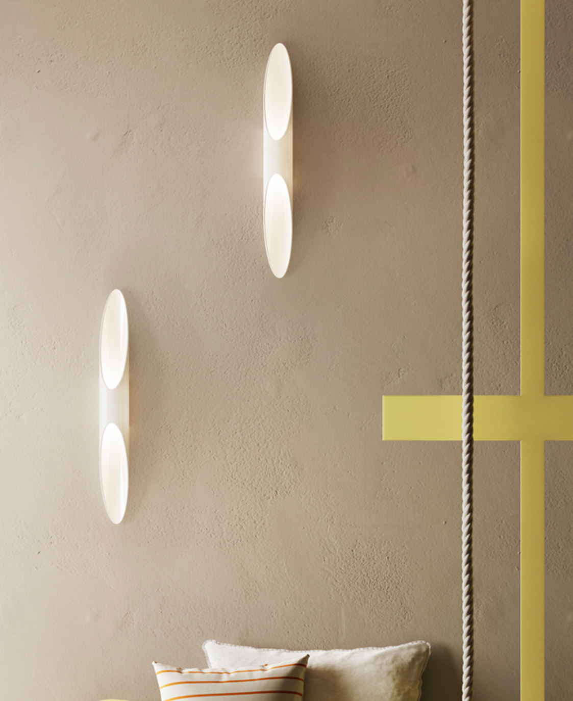 Double light wall lamp with tubular light diffuser in laser cut Plexiglas. Direct wall mounting version. Dimmability dependant on bulb. Product Codes: