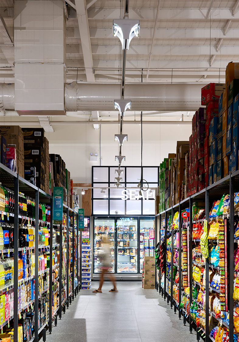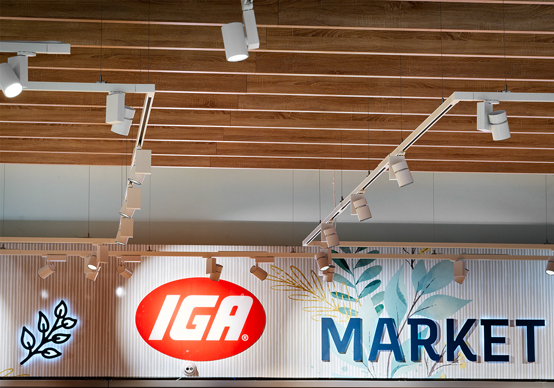 The Kinross IGA store recently underwent a full renovation, which included the installation of architectural light fittings from Ansorg. These light fixtures, from the Navo range, are designed to provide directed lighting that highlights products on the shelves without illuminating excess stock stored above. The renovation also included new flooring, signage, and a ceiling with timber accents, creating a welcoming and unique atmosphere for shoppers.